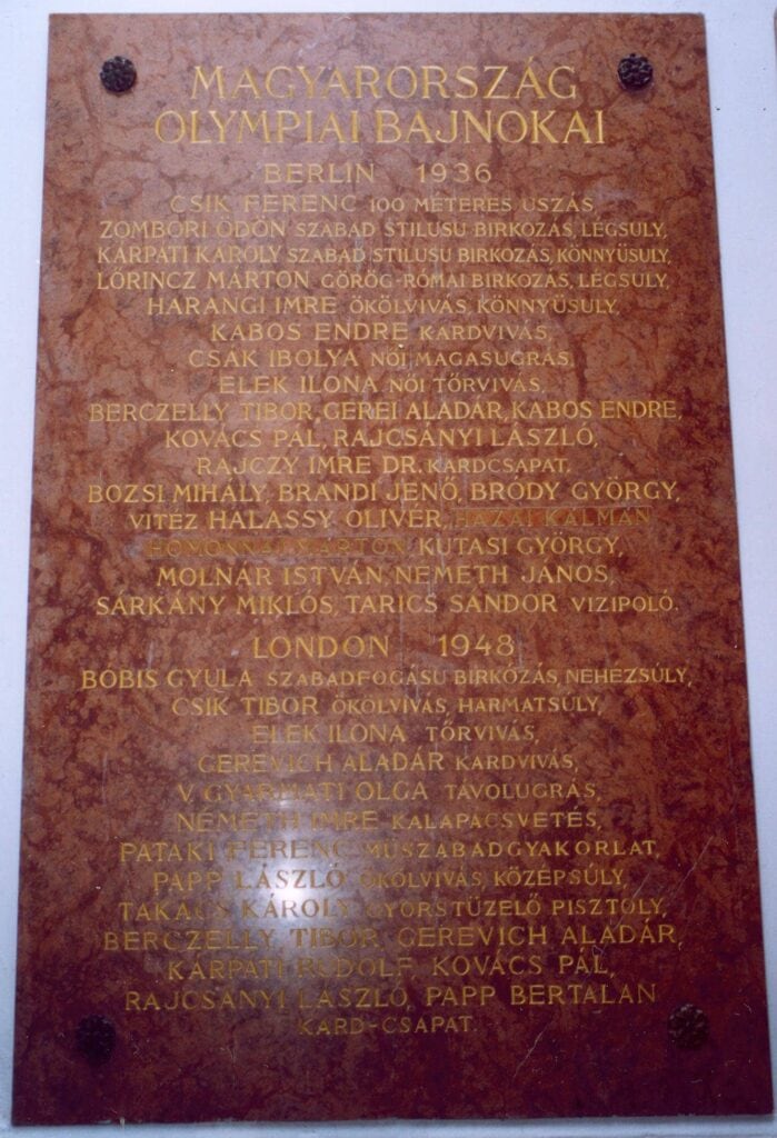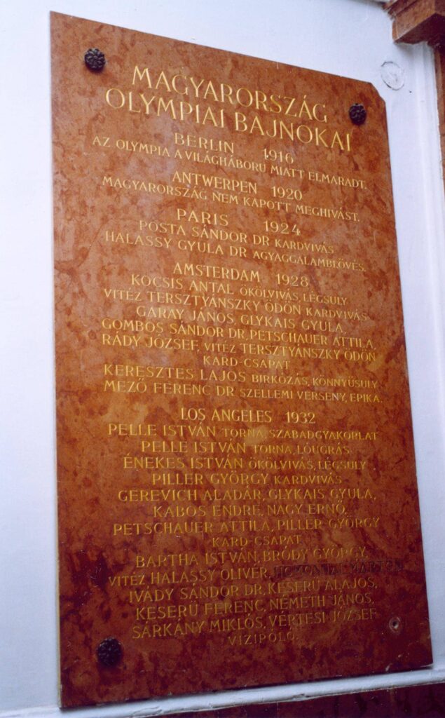 Magyarország olimpiai bajnokai 1916 Berlin : 1920 Antwerpen : 1924 Paris : 1928 Amsterdam : 1932 Los Angeles : emléktábla