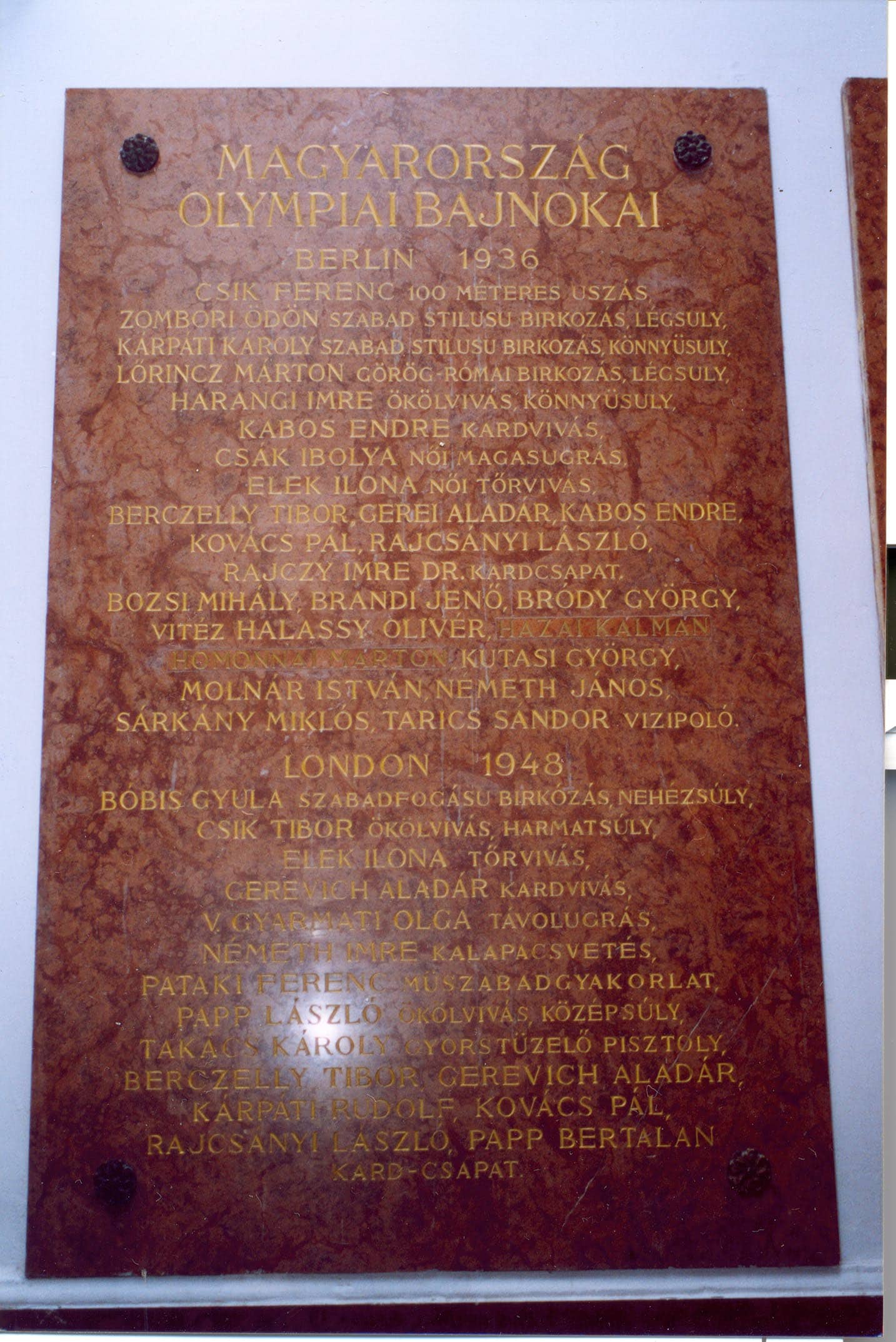 Magyarország olimpiai bajnokai 1916 Berlin : 1920 Antwerpen : 1924 Paris : 1928 Amsterdam : 1932 Los Angeles : emléktábla