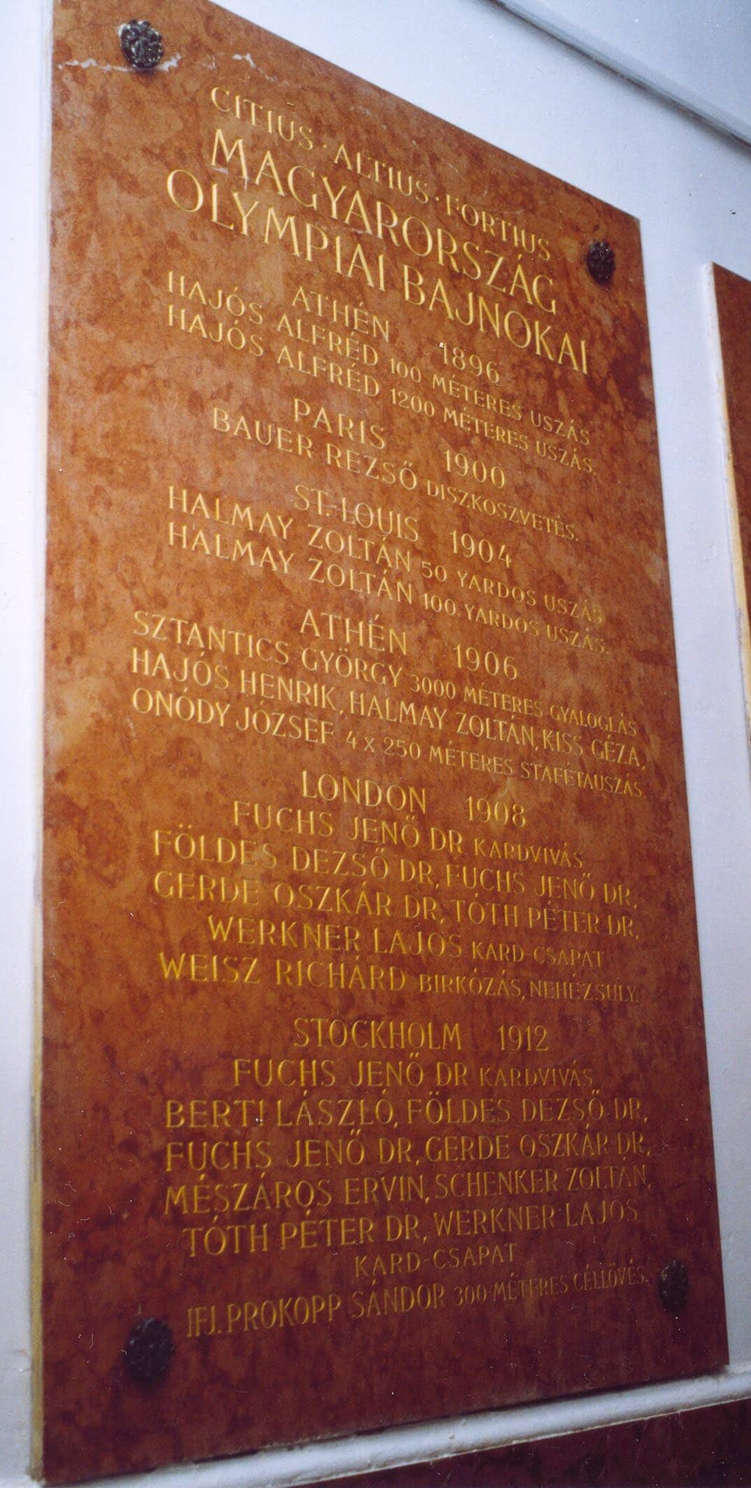 Magyarország olimpiai bajnokai 1896 Athén : 1900 Paris : 1904 St. Louis : 1906 Athén : 1908 London : 1912 Stockholm : emléktábla